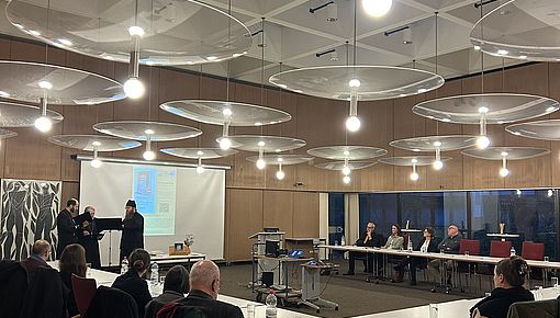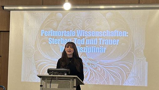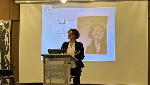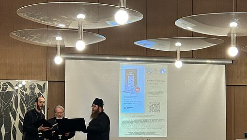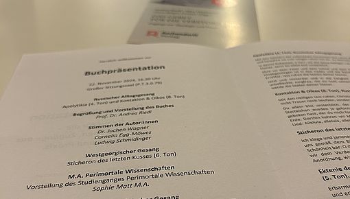 Im großen Sitzungssaal der Fakultät für katholische Theologie fanden sich Autor:innen, Studierende, Dozent:innen und Freund:innen der Fakultät ein. Zu Beginn begrüßte Prof. Dr. Andrea Riedl die Gäste, dankte den Sponsoren und skizzierte das Konzept und den Inhalt des Buches. Mit Dr. Jochen Wagner, Cornelia Egg-Möwes und Ludwig Schmidinger kamen drei der Autor:innen zu Wort. Den musikalischen Beitrag gestalteten Mitglieder der orthodoxen Gemeinden Regensburgs - Dr. Gregory Tucker, Georg Hahn und Andei Ciobanu - mit Hymnen zum Totengedenken aus der byzantinischen Tradition. Sophie Matt M.A., wissenschaftliche Mitarbeiterin am Lehrstuhl für Moraltheologie, präsentierte den Studiengang Perimortale Wissenschaften, der seit einigen Jahren an der Fakultät für Katholische Theologie in Regensburg angeboten wird (hier finden Sie mehr Informationen dazu). Mit einem kleinen Empfang fand die Veranstaltung einen gelungen Abschluss.