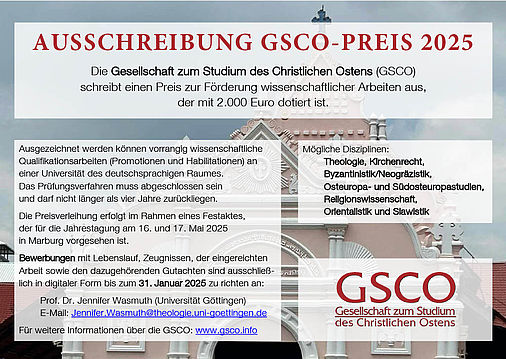 Die Gesellschaft zum Studium des Christlichen Ostens (GSCO) ist eine Arbeitsgemeinschaft wissenschaftlich arbeitender Institute und Einzelpersonen im deutschen Sprachraum zur Erforschung des Christlichen Ostens. Sie hat einen Preis zur Förderung wissenschaftlicher Arbeiten gestiftet, die dem Studium des Christlichen Ostens gewidmet sind und die wissenschaftlichen Kenntnisse unseres Fachgebiets wesentlich befördern. Der GSCO-Preis ist mit 2.000 € dotiert und wird im zweijährigen Turnus vergeben.