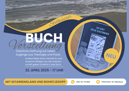 Am Dienstag, 22. April 2025, findet um 17.00 Uhr in der Katholischen Pfarrei St. Nikolaus auf der Insel Langeoog die Buchvorstellung unserer Neuerscheinung "Das Gebet für die Verstorbenen. Zugänge aus Theologie und Praxis" (hgg. Riedl/Haslwanter/Feulner) statt. Gastgeberin ist die beteiligte Autorin Susanne Wübker, Gemeindeleiterin und Pastoralreferentin auf Langeoog. Veranstalter sind zudem Prof. Dr. Andrea Riedl (Universität Regensburg, Herausgeberin und Autorin) sowie Prof. Dr. Klaus Vechtel SJ (Hochschule Sankt Georgen und Autor).