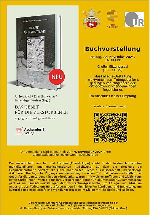 Am vergangenen Freitag, den 22. November 2024, fand an der Universität Regensburg eine Buchpräsentation zum neu veröffentlichten Sammelband "Das Gebet für die Verstorbenen. Zugänge aus Theologie und Praxis" statt.