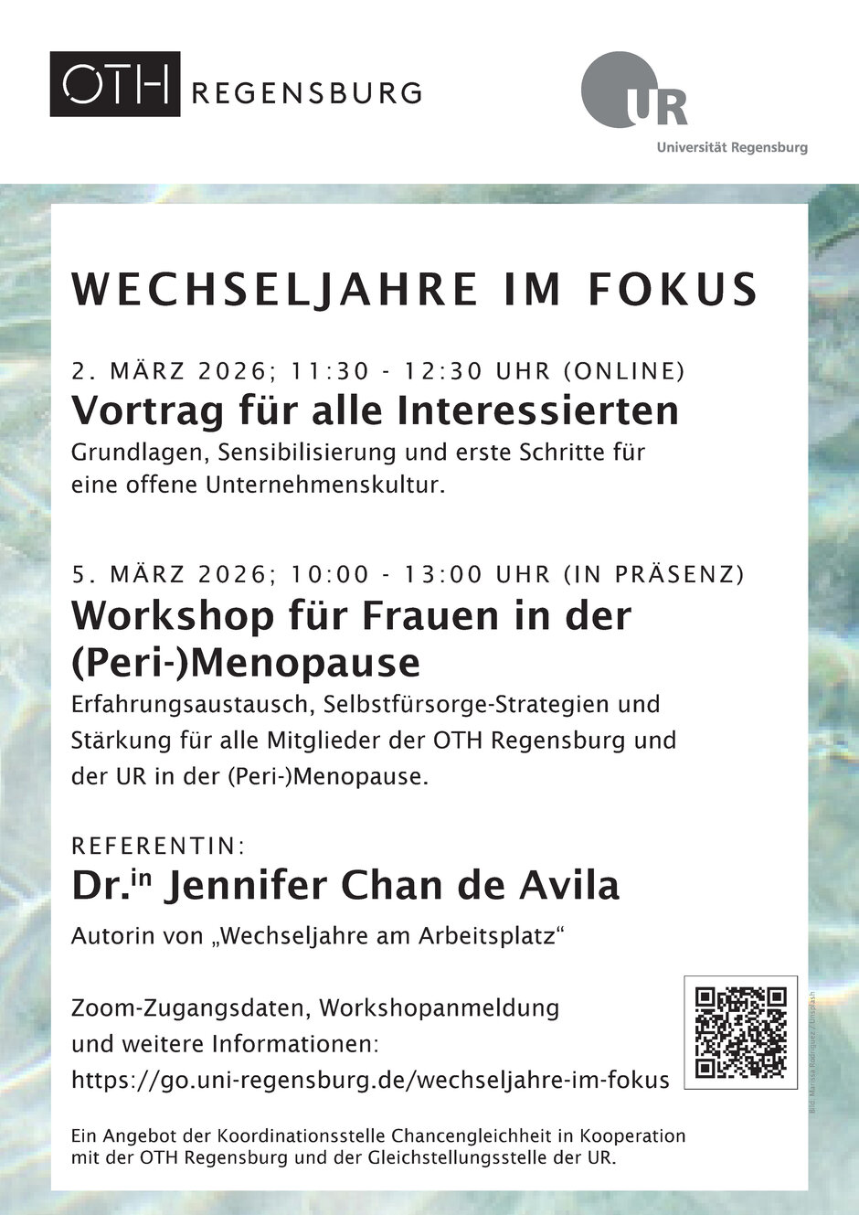 In Kooperation mit der Servicestelle Gleichstellung und Vielfalt der OTH Regensburg und der Gleichstellungsbeauftragten des wissenschaftsunterstützenden Personals organisiert die Koordinationsstelle Chancengleichheit im Jahr 2026 Veranstaltungen zum Thema. Ziel ist es, zu einer Enttabuisierung und Entstigmatisierung beizutragen sowie Wissensaufbau zum Thema zu befördern, um unsere Hochschulen zu geschlechtergerechteren Arbeitsplätzen zu machen.