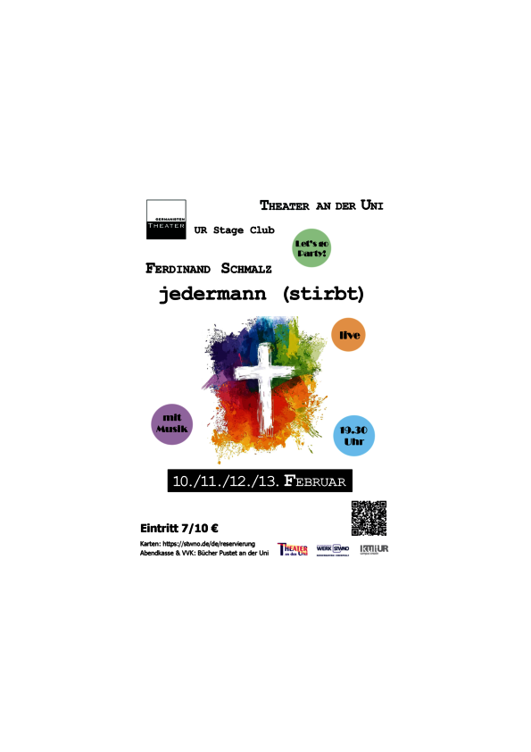 Vom 10. bis 13. Februar 2026 zeigt das Germanistentheater der Uni Regensburg gemeinsam mit dem UR Stage Club jeweils um 19.30 Uhr Ferdinand Schmalz‘ gefeierte Neuschreibung von Hugo von Hofmannsthals Spiel vom Sterben des reichen Mannes „Jedermann“ im Theater an der Uni mit Live-Musik.