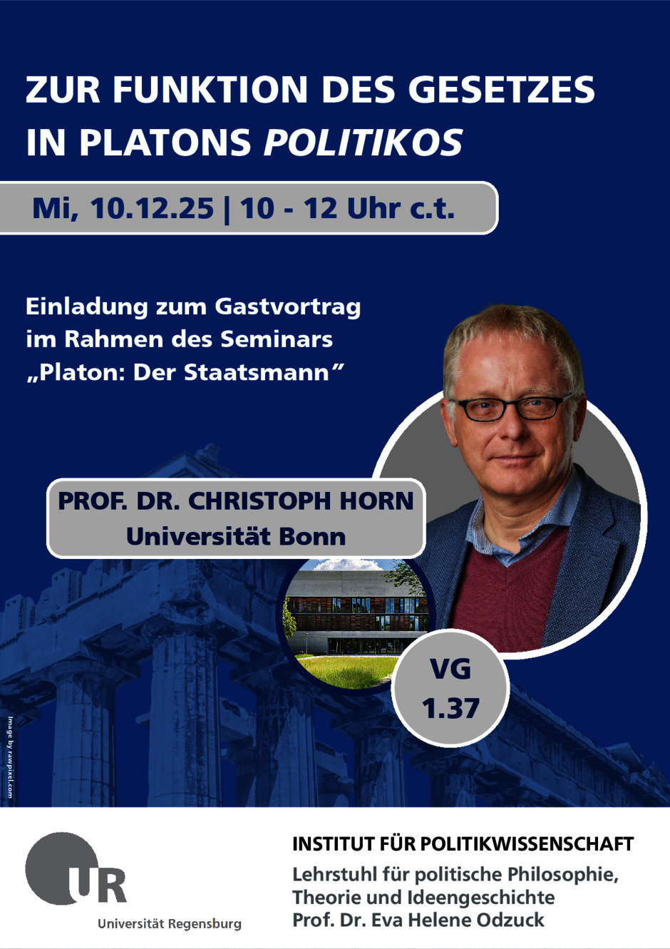 Der Gastvortrag findet im Rahmen des Seminars "Platon: Der Staatsmann" statt und wird vom Lehrstuhl für politische Philosophie, Theorie und Ideengeschichte (Prof. Dr. Eva Helene Odzuck) organisiert.
