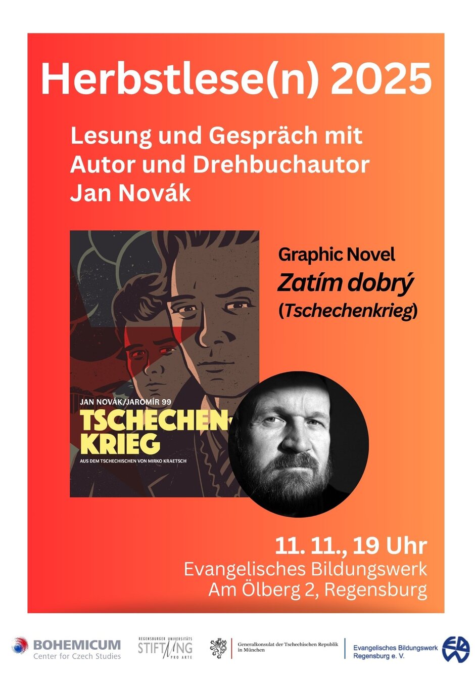 - Gespräch und Lesung mit dem Autor Jan Novák. Das Gespräch wird simultan übersetzt.