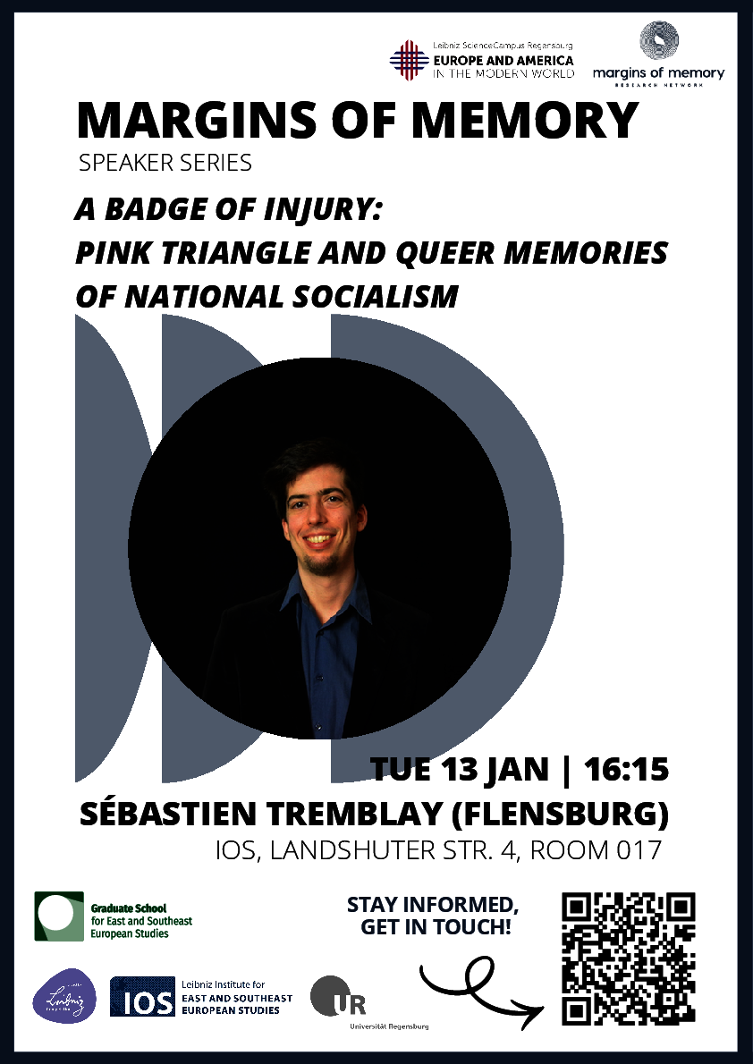 In this talk, Dr. Sébastien Tremblay (Europa-Universität Flensburg) will explore the memory of the persecutions of queer individuals underNational Socialism. He will examine how symbols (circulated through printed media and displayed at protests) shaped a shared narrative of memory across the Euro-American world. The talk will address not only the successes of this collective remembrance andthe recognition of queerness as a key category within official, state-sanctioned memory of National Socialist crimes, but also the exclusions that have marginalized certain queer experiences in these debates. Drawing from his book A Badge of Injury (De Gruyter 2024), Dr. Tremblay will also emphasize the importance of provincializing queer history within and outside the Euro-American context and demonstrate the need to understand knowledge exchanges across languages from a transregional perspective.