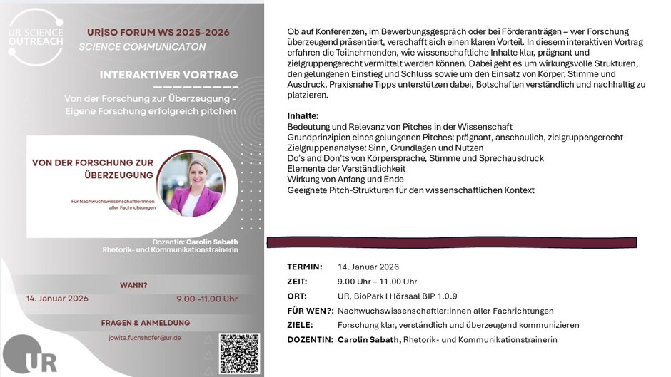 Ob auf Konferenzen, im Bewerbungsgespräch oder bei Förderanträgen – wer Forschung überzeugend präsentiert, verschafft sich einen klaren Vorteil. In diesem interaktiven Vortrag erfahren die Teilnehmenden, wie wissenschaftliche Inhalte klar, prägnant und zielgruppengerecht vermittelt werden können. Dabei geht es um wirkungsvolle Strukturen, den gelungenen Einstieg und Schluss sowie um den Einsatz von Körper, Stimme und Ausdruck. Praxisnahe Tipps unterstützen dabei, Botschaften verständlich und nachhaltig zu platzieren.