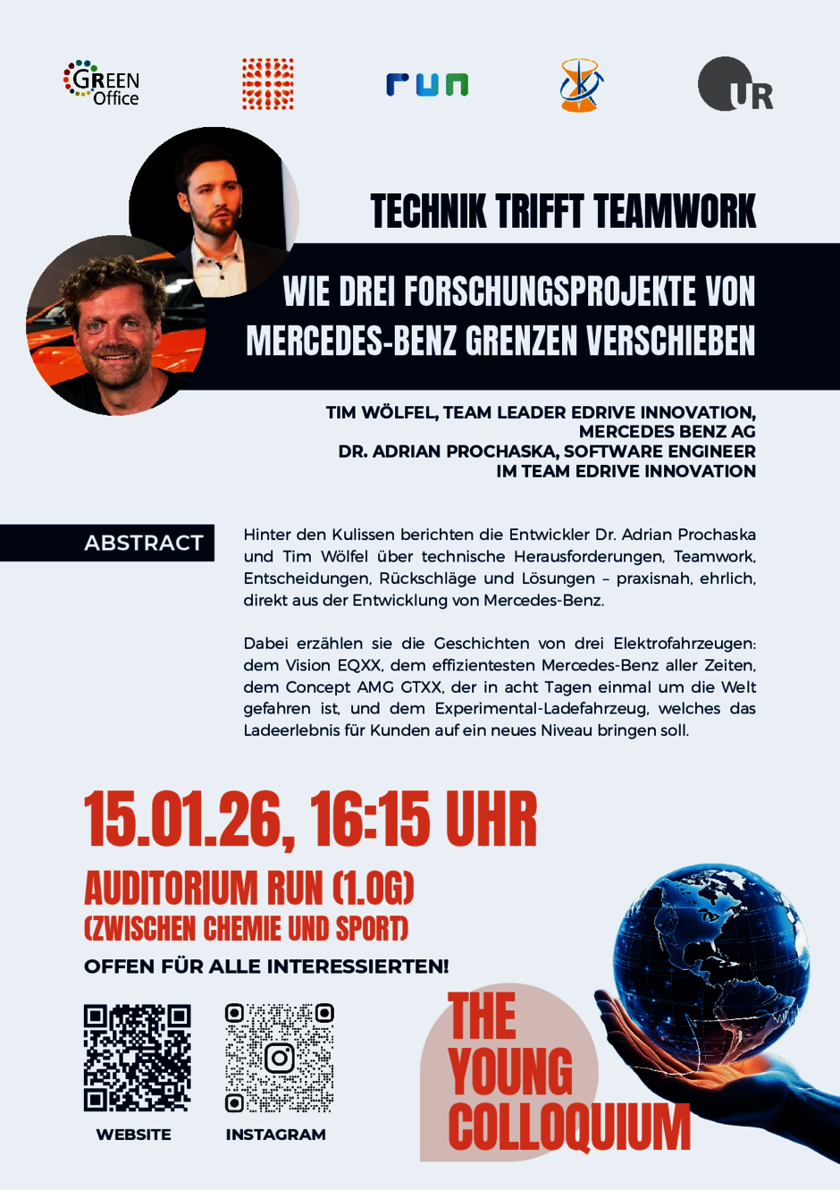 Zum Format: Die Veranstaltung richtet sich an Studierende aller Fakultäten und setzt keine Anmeldung oder Vorwissen voraus. Sie ist Teil der studentisch organisierten, interdisziplinären Vortragsreihe "The Young Colloquium". In Vorträgen zu verschiedenen globalen Problemen des 21. Jahrhunderts wollen wir neue Perspektiven und mögliche Lösungsansätze beleuchten. Im Anschluss an die Vorträge kann in entspannter Atmosphäre bei Pizza und Freigetränken weiterdiskutiert werden. Weitere Informationen und alle unsere Vorträge: https://run-regensburg.de/event/young-colloquium-overview/ (externer Link, öffnet neues Fenster).