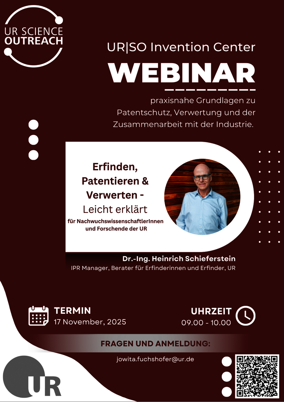 Das Invention Center von UR Science Outreach lädt zur kompakten Online-Veranstaltung rund um den Weg von der Erfindung zur Anwendung ein.