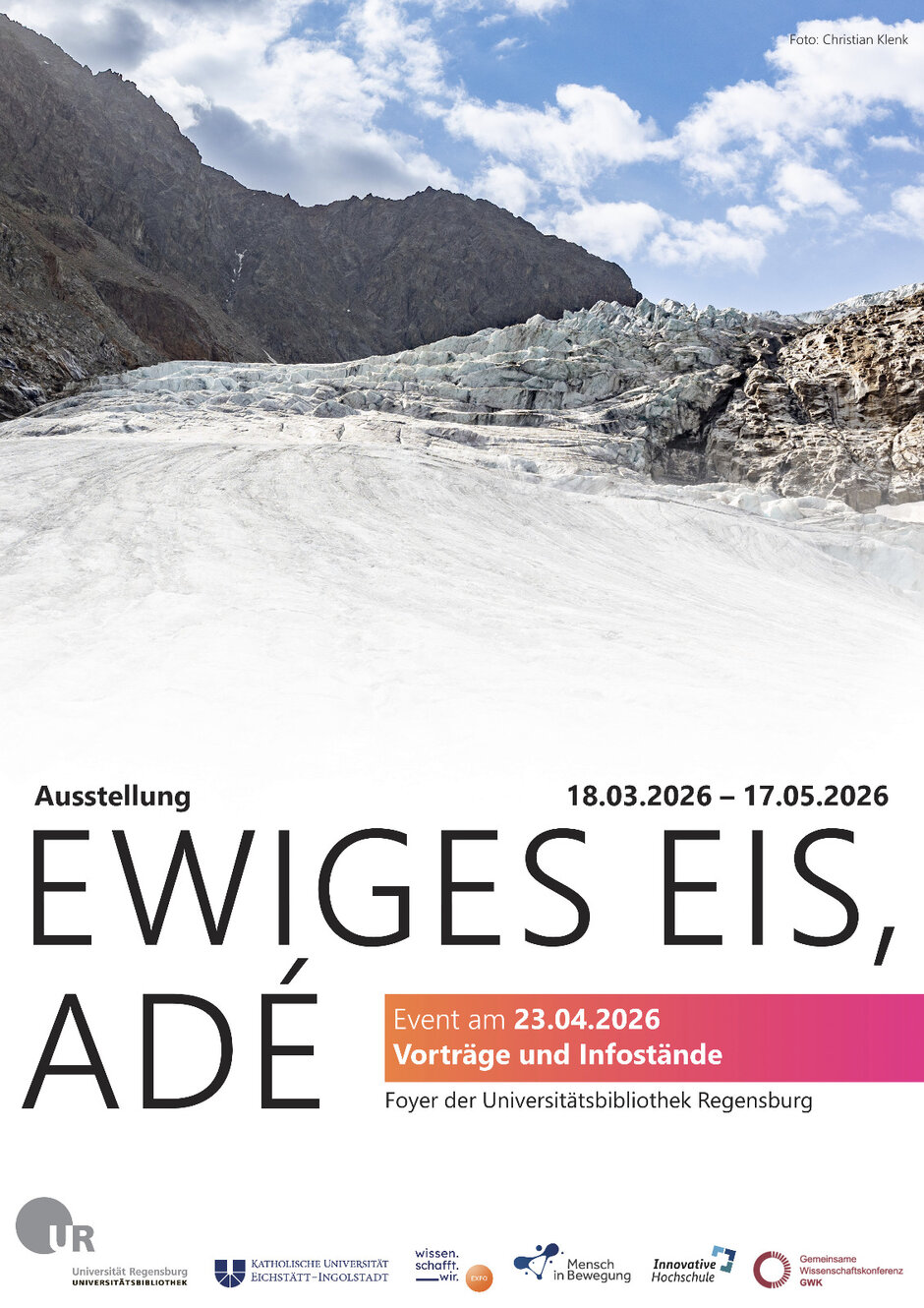 Die Wanderausstellung „Ewiges Eis, adé“, die von 18.03.-17.05.2026 in der Universitätsbibliothek der Universität Regensburg zu sehen ist, wurde von einem Team der KU Eichstätt-Ingolstadt unter Leitung der Geographie-Fakultät entwickelt.