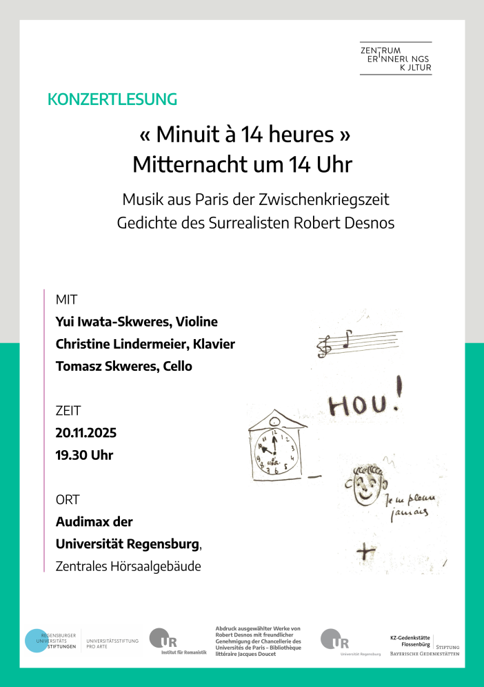 Die Veranstaltungsreihe „Robert Desnos – Surrealismus und Résistance“ will nun auch der Kunst von Robert Desnos ihren Raum geben und so ein vollständiges Bild seiner Person zeichnen. Die Konzertlesung „Minuit à 14 heures“ widmet sich den Klangbildern in der Musik aus Paris der Zwischenkriegszeit und im Werk des vielfältigen Künstlers Robert Desnos, der sich sowohl als Lyriker als auch als Radioavantgardist, Journalist und Mitbegründer des Surrealismus in Frankreich einen Namen gemacht hatte. Die Veranstaltung findet in Kooperation mit dem Institut für Romanistik der Universität Regensburg und dem Universitätsorchester statt. Die Gedichte werden in deutscher Sprache vorgetragen. Der Eintritt ist frei.