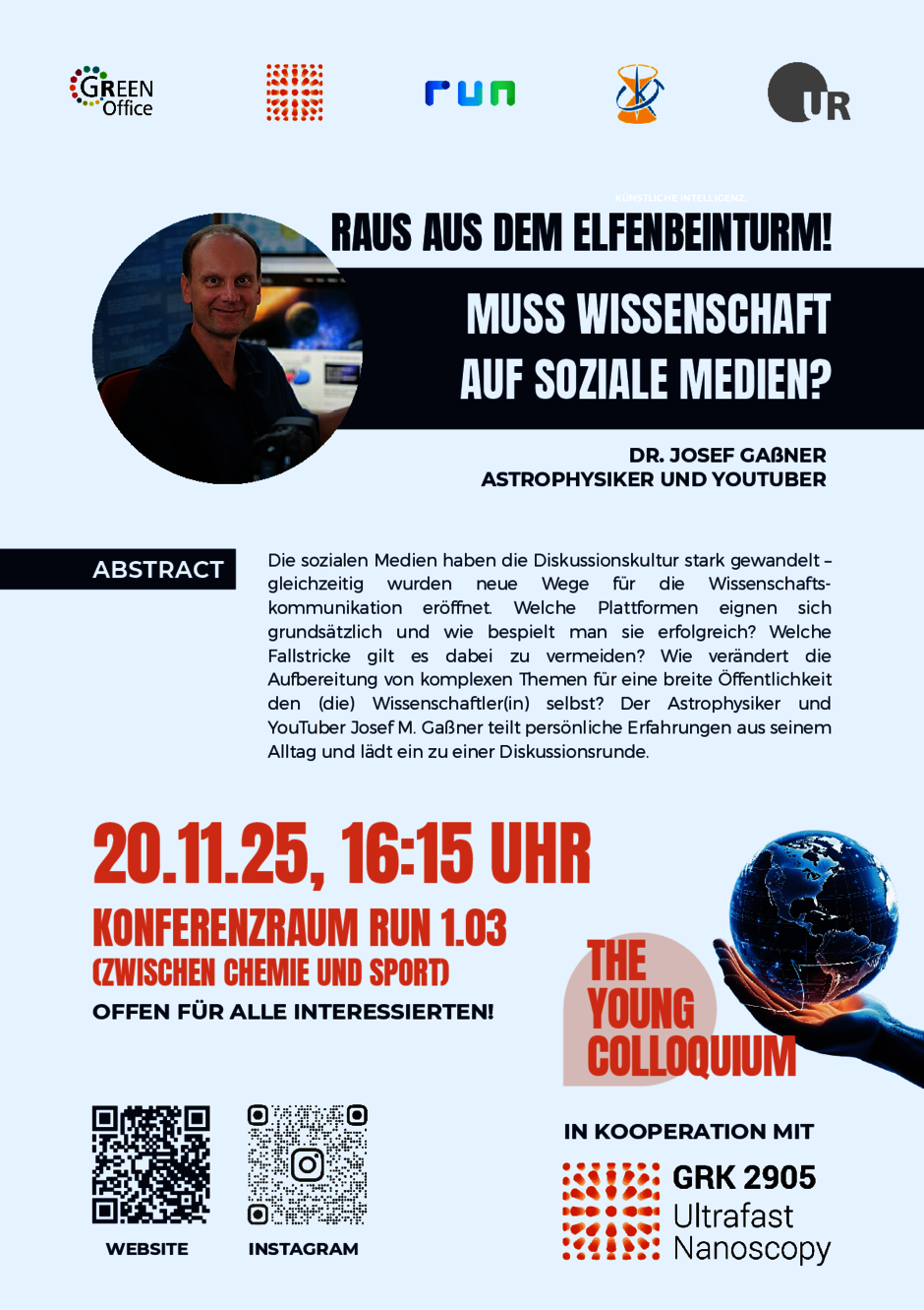 Zum Format: Die Veranstaltung richtet sich an Studierende aller Fakultäten und setzt keine Anmeldung oder Vorwissen voraus. Sie ist Teil der studentisch organisierten, interdisziplinären Vortragsreihe "The Young Colloquium". In Vorträgen zu verschiedenen globalen Problemen des 21. Jahrhunderts wollen wir neue Perspektiven und mögliche Lösungsansätze beleuchten. Im Anschluss an die Vorträge kann in entspannter Atmosphäre bei Pizza und Freigetränken weiterdiskutiert werden. Weitere Informationen und alle unsere Vorträge: https://run-regensburg.de/event/young-colloquium-overview/ (externer Link, öffnet neues Fenster).