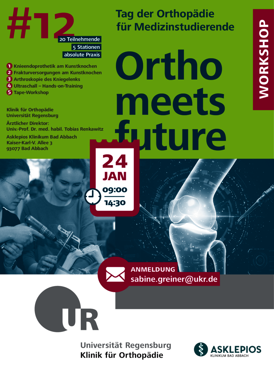 Die Veranstaltung „Tag der Orthopädie für Medizinstudierenden“ im Format „Ortho meets Future“ findet am Samstag, den 24.01.2026 an die Klinik für Orthopädie der Universität Regensburg in Bad Abbach statt.