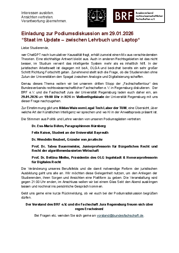 Als Teil der Veranstaltungsreihe "Fachschaftentour" soll die Podiumsdiskussion "Staat im Update - zwischen Lehrbuch und Laptop" zentrale Fragen in der juristischen Ausbildung klären: Wie gehen wir mit der fortschreitenden Digitalisierung um? Welche Rolle spielt KI für die Justiz der Zukunft? Wo muss sich die juristische Ausbildung ändern, um dem Zeitgeist gerecht zu werden?