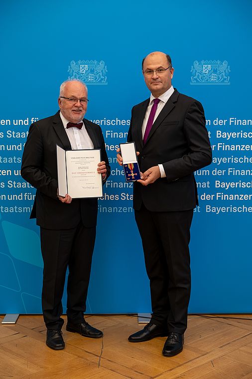 Spender-gegen-Empfänger-Erkrankungen (GvHD) durch transplantierte Spender-Immunzellen gelten bis heute als Hauptkomplikation der allogenen Stammzelltransplantation und gehen mit erheblicher Morbidität und auch Mortalität einher. Professor Dr. Ernst Holler, langjähriger Oberarzt und „Vater“ des Stammzelltransplantationsprogrammes in der Klinik und Poliklinik für Innere Medizin III des Universitätsklinikums Regensburg (UKR), hat sich sein berufliches Leben lang dieser Komplikationen nach allogener Stammzelltransplantation und der Verbesserung der klinischen Behandlungsstrategien und Versorgungstrukturen für die Patienten gewidmet. Für sein Lebenswerk wurde Professor Holler mit dem Bundesverdienstkreuz am Bande ausgezeichnet, das ihm der Bayerische Finanz- und Heimatminister Albert Füracker überreichte. „Professor Holler kümmerte sich während seiner gesamten beruflichen Laufbahn in bemerkenswerter Weise um Patienten mit Knochenmarkerkrankungen. Mit viel Beharrlichkeit, Empathie sowie hoher ärztlicher und wissenschaftlicher Kompetenz versuchte er das Leid seiner Patienten zu lindern. Dieses Engagement setzt er bis heute als Senior-Professor im Ruhestand fort“, würdigt Staatsminister Füracker die Lebensleistung des Mediziners.