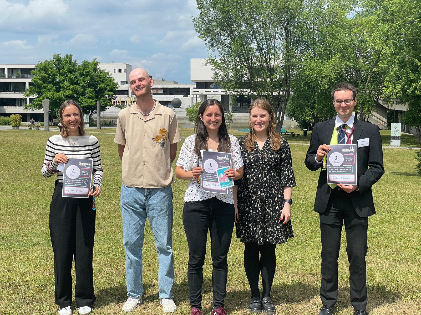 Unmittelbar danach startete das Hauptprogramm mit dem ChemSlam, organisiert und moderiert von Alissa Wieberneit und Michael Lößl. Drei Doktorand*innen der Fakultät präsentierten dabei in maximal fünf Minuten ihre Forschungsprojekte auf besonders anschauliche und unterhaltsame Weise. Besonders beeindruckte Vivien Fleischmann das Publikum mit einem Vortrag über Nanofasern in bayerischer Mundart und sicherte sich damit den ersten Platz im Wettbewerb. Weitere Beiträge kamen von Naomi Weitzel, die mit einer lebendigen Präsentation über leuchtende Nanopartikel überzeugte, sowie von Ferdinand Wäscher, der seine bunten Liposomen pointiert darstellte.