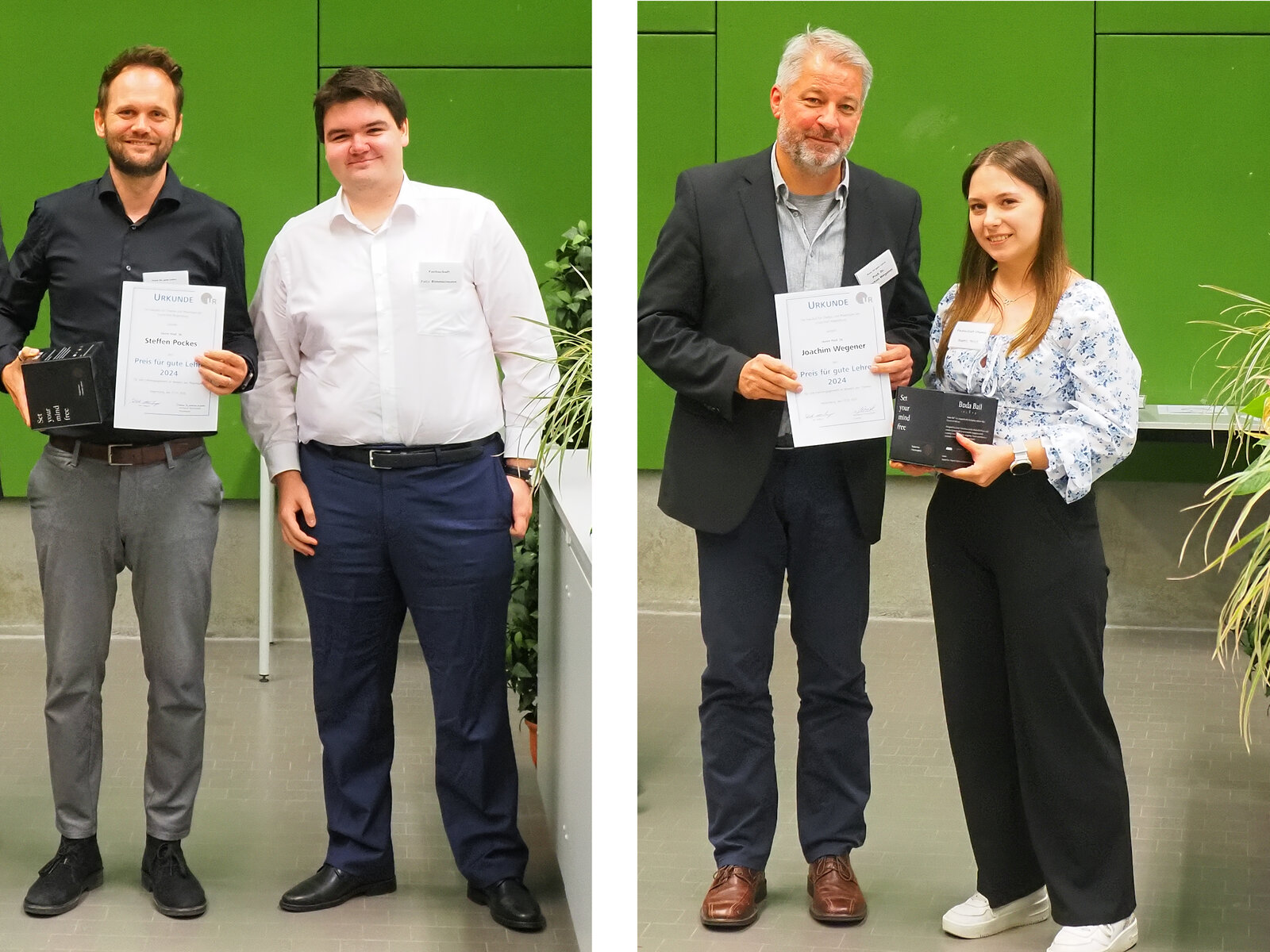 Abschließend wurden zwei Dozenten mit dem Preis der Fakultät für gute Lehre ausgezeichnet, Prof. Dr. Joachim Wegener (Analytische Chemie) und Prof. Dr. Steffen Pockes (Pharmazeutische und Medizinische Pharmazie). Die Fachschaften, vertreten durch Sophie Woick und Felix Bimmermann, hoben hervor, dass die Auszeichnung in Anerkennung besonderer Leistungen in der Lehre sowie des Engagements bei der Gestaltung der Lehrveranstaltungen verliehen werde – mit direktem Bezug auf die konkret durchgeführten Formate der beiden Preisträger.