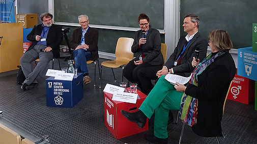 Weitere Perspektiven auf die zentrale Rolle der Dozierenden bei der Verankerung von BNE an den Hochschulen steuerten Prof. Dr. Franz Waldherr, Direktor des Zentrums für Hochschuldidaktik der bayerischen Hochschulen für angewandte Wissenschaften, sowie der Umweltethiker Prof. Dr. Thomas Potthast von der Universität Tübingen bei. Alle Fishbowl-Diskutanten waren sich einig, dass der 2017 verabschiedete Nationale Aktionsplan Bildung für nachhaltige Entwicklung im Rahmen des UNESCO-Weltaktionsprogramms eine gute Grundlage für koordinierte Forderungen und Anstrengungen im Bildungsbereich bietet. Hochschulen sind als Forschungs- und Bildungseinrichtungen zentral für eine nachhaltige Entwicklung: „Durch Forschung und Lehre erarbeiten und vermitteln Hochschulen Wissen, Kenntnisse, Kompetenzen und Werte und bilden Multiplikatorinnen und Multiplikatoren und zukünftige Führungskräfte aus.“