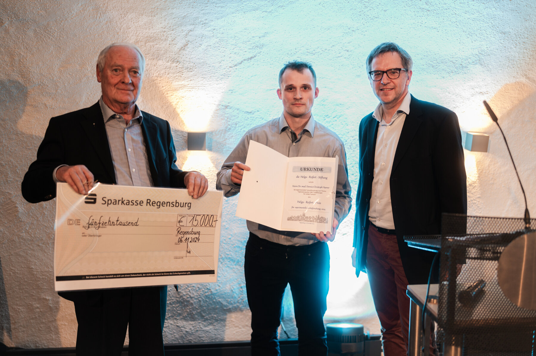 Dr. Dennis Harrer wurde für seine Forschung an CAR-T-Zellen, die das Potenzial haben, schwere Tumorerkrankungen zu behandeln, ausgezeichnet. Gemeinsam mit Prof. Luca Gattinoni arbeitet er an der Entwicklung verbesserter Zelltherapien. Der zweite Preisträger, Dr. Alexander Scheiter, wurde für seine Arbeit zur Tumorpathologie und seinen Einsatz im Molekularen Tumorboard Regensburg geehrt. Seine Forschung bietet neue Einblicke in die personalisierte Krebstherapie und das Cholangiokarzinom.