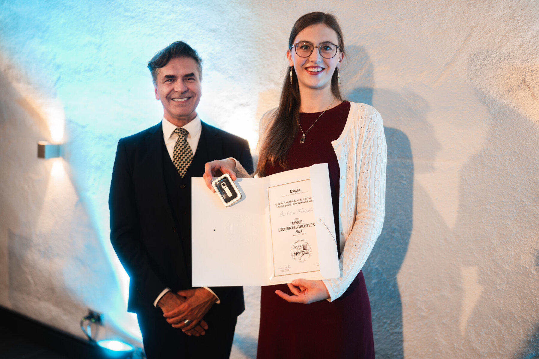 Der ESdUR-Abschlusspreis wurde an vier herausragende Absolvent*innen verliehen: Florian Pritscher (Katholische Theologie) für seine Arbeit zur Theodizeefrage, Dr. Georg Lindner (Medizin) für seine Untersuchungen an onkolytischen Herpesviren, Simon Pfahler (Physik) für sein Modell zur Krebserkrankungsprogression und Barbara Maiwald (Biologie) für ihre lichtsensitive Methode zur Proteinlokalisation. Die Arbeiten zeichnen sich durch hohe wissenschaftliche Qualität und gesellschaftliche Relevanz aus.