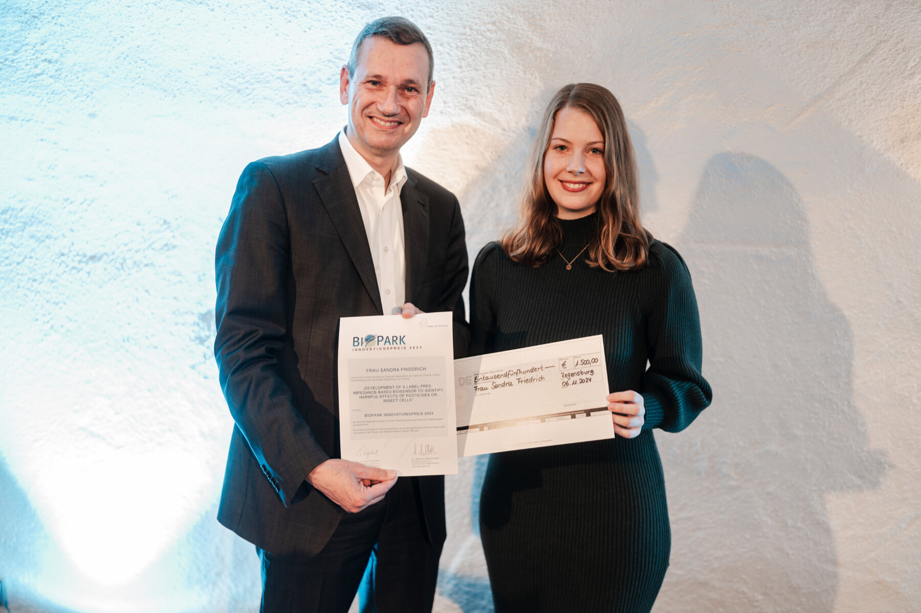 Der BioPark-Innovationspreis, gestiftet von der BioPark Regensburg GmbH und der Patentanwaltskanzlei Dehmel & Bettenhausen, wurde an Sandra Friedrich und Dr. Moritz Burger verliehen. Friedrich wurde für ihren neuartigen Schnelltest zur Prüfung insektizider Wirkstoffe ausgezeichnet, der zur Verringerung des Insektensterbens beitragen soll. Dr. Burger erhielt den Preis für sein innovatives Implantat zur minimalinvasiven Behandlung von Augenhöhlenfrakturen, dessen Entwicklung er in Kooperation mit dem Regensburg Center of Biomedical Engineering (RCBE) und der Gerresheimer Regensburg GmbH vorantrieb.