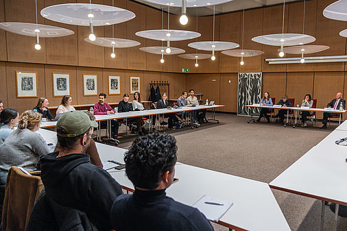 Initiiert wurde der Austausch zwischen den Studierenden und Frau Lador-Fresher im Rahmen des Antrittsbesuchs der Generalkonsulin an der Universität Regensburg im vergangenen November. In Vertretung von Universitätspräsident Prof. Dr. Udo Hebel hieß Prof.in Dr. Ursula Regener, Vizepräsidentin für Internationalisierung und Diversity, den Gast aus München, die seit ihrem Amtsantritt im September 2023 bereits zum dritten Mal die Universität Regensburg besuchte, willkommen. Alle bisherigen Besuche seien von den Ereignissen des 7. Oktober geprägt gewesen, demonstrierten aber zugleich die fortgesetzt enge Zusammenarbeit der Wissenschaftler:innen der Universität mit ihren Kolleg:innen in Israel – insbesondere mit den beiden Partneruniversitäten in Be‘er-Scheva und Universität Haifa – in Forschung, Studium und Lehre.