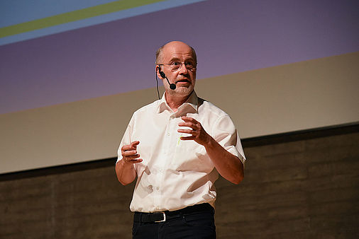 Lesch tritt auf, das Audimax wird zum Sternentheater. In fünf Minuten schafft Harald Lesch eine szenische Anordnung auf der weitgehend leeren Bühne, deren Requisiten sich bis zu diesem Zeitpunkt auf einen Eimer, eine Tafel, das tagungsübliche unverständliche Blumengesteck und ein Rednerpult beschränken. „Zu meiner Linken – das ist der Globus. Die Erde, wie wir sie benutzen, wie wir sie in Ketten legen, in Netze, in Pipelines. Der Globus, das ist der Planet, den wir ausnehmen, aus dem wir herausholen, was wir können, seit vielen Jahrhunderten.“ Dann rückt Lesch die andere Bühnenseite ins Blickfeld: „Hier rechts sehen Sie den Planeten, den wir auf diesem Weg verändern.“ Fortan begleiten Globus Erde und Planet Erde den Redner, den stellvertretenden Menschen, der sich zwischen beiden bewegt und der sich vor allem eins wünscht: Wohlbefinden und Gesundheit.