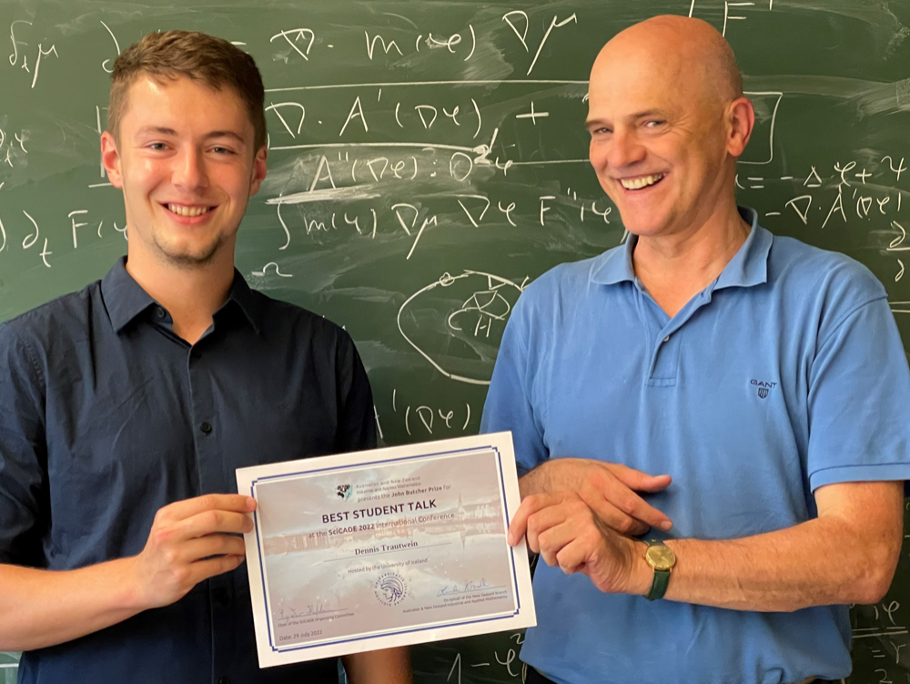 Der Doktorand der Mathematik trug am ersten Konferenztag im kleineren Kreis vor, am letzten Tag war er der einzige „junior participant“ im 300-köpfigen Plenum, in dem die Weltkoryphäen der Mathematik saßen, berichtet Doktorvater Harald Garcke. Er freut sich sichtlich mit seinem Doktoranden: „Mich hat der Preis am Ende der Konferenz gar nicht mehr überrascht, denn schon am ersten Tag, als Dennis‘ Vortrag zum Ende kam, flüsterten mir die ersten Kollegen zu – das war ja klasse!“ Mit dem neuseeländischen Mathematiker John Butcher, zwischenzeitlich knapp 90, ist Dennis Trautwein nun im Anschluss an die Konferenz in E-Mail-Austausch. Eine weitere Auszeichnung, denn in der Mathematik ist der Name Butcher ein Begriff – „jedem Studierenden begegnet das Butcher-Tableau schon im Grundstudium“, sagt Professor Dr. Harald Garcke. „Ich erinnere mich an meine eigene Drittjahres-Vorlesung ...“