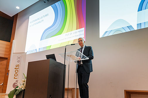 Im gut gefüllten H 24 des Vielberth-Gebäudes begrüßte Universitätspräsident Hebel Lehrende und Studierende, UR-Alumni und Gäste aus Wirtschaft und Stadtgeschehen. Der Universitätspräsident dankte denen, die die Auftaktveranstaltung gemeinsam organisiert haben: Das Green Office bzw. Nachhaltigkeitsbüro der Universität Regensburg unter Leitung von Ann-Kathrin Roßner, Dr. Norbert Meckl, Vorstandsmitglied von roots e. V., dem Alumniverein der Fakultät für Wirtschaftswissenschaften an der Universität Regensburg und der Stadt Regensburg/Green Deal Regensburg.