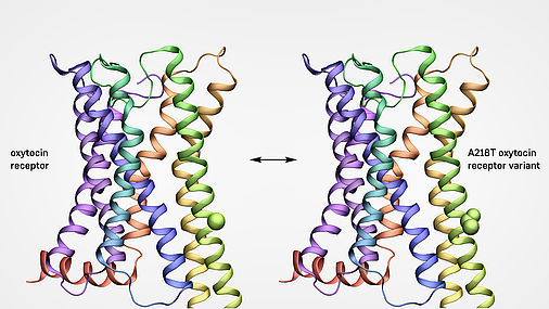 Nun konnten die beiden Teams aus Regensburg und Jülich zeigen, dass eine Veränderung der Basenabfolge im Gen des Oxytocin-Rezeptors auch das Gen-Produkt, also das Rezeptor-Eiweißmolekül, und die nachfolgende Zellantwort auf Oxytocin verändert. Dr. Magdalena Meyer und Dr. Benjamin Jurek (Universität Regensburg) konnten eine erhöhte Signalantwort der Zellen nachweisen, die diese Mutation tragen. Auch werden in der Zelle durch Oxytocin andere Gene reguliert, darunter auch Gene, die als Risikofaktoren für Autismus identifiziert werden konnten. Darauf aufbauend konnten Jun.-Prof. Mercedes Prieto-Alfonso und weitere Kollegen des Forschungszentrums Jülich mithilfe von Computersimulationen berechnen, dass die Mutation tatsächlich die Struktur des Rezeptorproteins verändert, was zu einer erhöhten Stabilität und Sensibilität der Rezeptorvariante führt.
