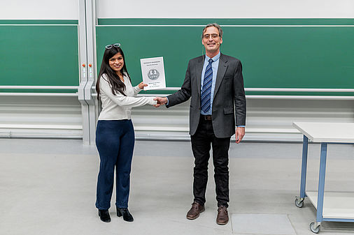 Als letzte Ehrung wurde der jährlichen Förderpreis „Dozentur Professor Bernhard Heß“ von Prof. Dr. John Lupton an Dr. Ekta Chaubey Sotnikov übergeben. Dr. Chaubey Sotnikov habilitiert derzeit an der Universität Bonn. In seiner Laudatio beschrieb Prof. Lupton Dr. Chaubey Sotnikov als „beispielhafte junge Wissenschaftlerin, die bedeutende Beiträge zu den analytischen Eigenschaften von Streuamplituden mit elliptischen Kurven geleistet hat.“ Die komplizierte Dynamik, die mit massiv Teilchen-Schleifen in Feynman-Diagrammen einhergeht, sei ein Schwerpunkt ihrer bahnbrechenden Forschung gewesen. „In einer bemerkenswerten Entdeckung hatte Dr. Chaubey Sotnikov in Zusammenarbeit mit ihren Kolleg*innen die noch nie dagewesene Möglichkeit, mehr als zwei elliptische Kurven in einem scheinbar einfachen physikalischen Streuprozess zu haben - eine Enthüllung, die die Horizonte unseres Verständnisses signifikant erweitert hat“, so Prof. Lupton. Die Regensburger Universitätsstiftung Bernhard Heß verleiht im Fachbereich Physik den jährlichen Förderpreis „Dozentur Professor Bernhard Heß“ in Höhe von 2.000 Euro. Diese Auszeichnung gibt herausragenden externen Nachwuchswissenschaftlern die Gelegenheit, Gastvorlesungen in Regensburg innerhalb des Fachgebiets zu halten und dient dazu, das Lehrangebot an der Universität zu bereichern. Der Preis wird am „Tag der Physik“ an der Universität Regensburg überreicht.