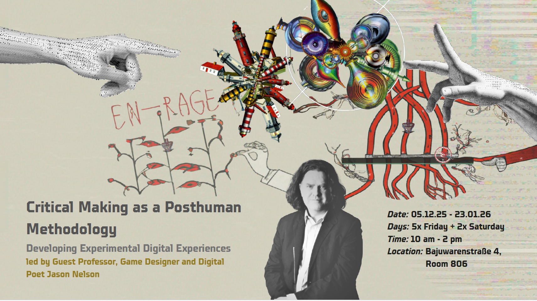 Im Wintersemester 2025/26 werden Prof. Dr. Astrid Ensslin (Dynamik virtueller Kommunikationsräume) und das DAS|LAB-Team zwei außergewöhnlich begabte Medienkünstler und Digitalpoeten von der Universität Bergen, Prof. Dr. Jason Nelson und Dr. Alinta Krauth, zu Gast haben. Prof. Nelson wird ein Blockseminar zum Thema „Critical Making as a Posthuman Methodology” für Studierende der UR anbieten (eine vollständige Beschreibung und den Zeitplan finden Sie im Vorlesungsverzeichnis – es sind noch Plätze frei (externer Link, öffnet neues Fenster)). Zwischen November und Januar werden Krauth und Nelson gemeinsam mit Forschern des DIMAS, der Universitätsbibliothek und der Stadt Regensburg an verschiedenen digitalen Kunstausstellungen und praxisorientierten Forschungsprojekten arbeiten.