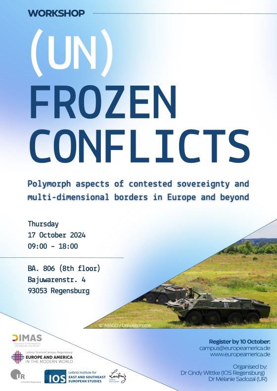 Das DIMAS freut sich am 17. Oktober 2024 gemeinsam mit dem IOS Regensburg (externer Link, öffnet neues Fenster)Kolleg*innen zu dem Workshop „(Un)Frozen Conflicts - Polymorph Aspects of Contested Sovereignty and Multi-Dimensional Borders in Europe and Beyond“ zu empfangen. Organisiert von Dr. Cindy Wittke (IOS Regensburg) (externer Link, öffnet neues Fenster) und Dr. Mélanie Sadozai (DIMAS) wird die Veranstaltung die Intersektion von Hoheits- und Territorialkonflikten in Osteuropa und darüber hinaus untersuchen. Das vollständige Tagesprogramm findet sich auf der Seite des LeibnizScience Campus.
