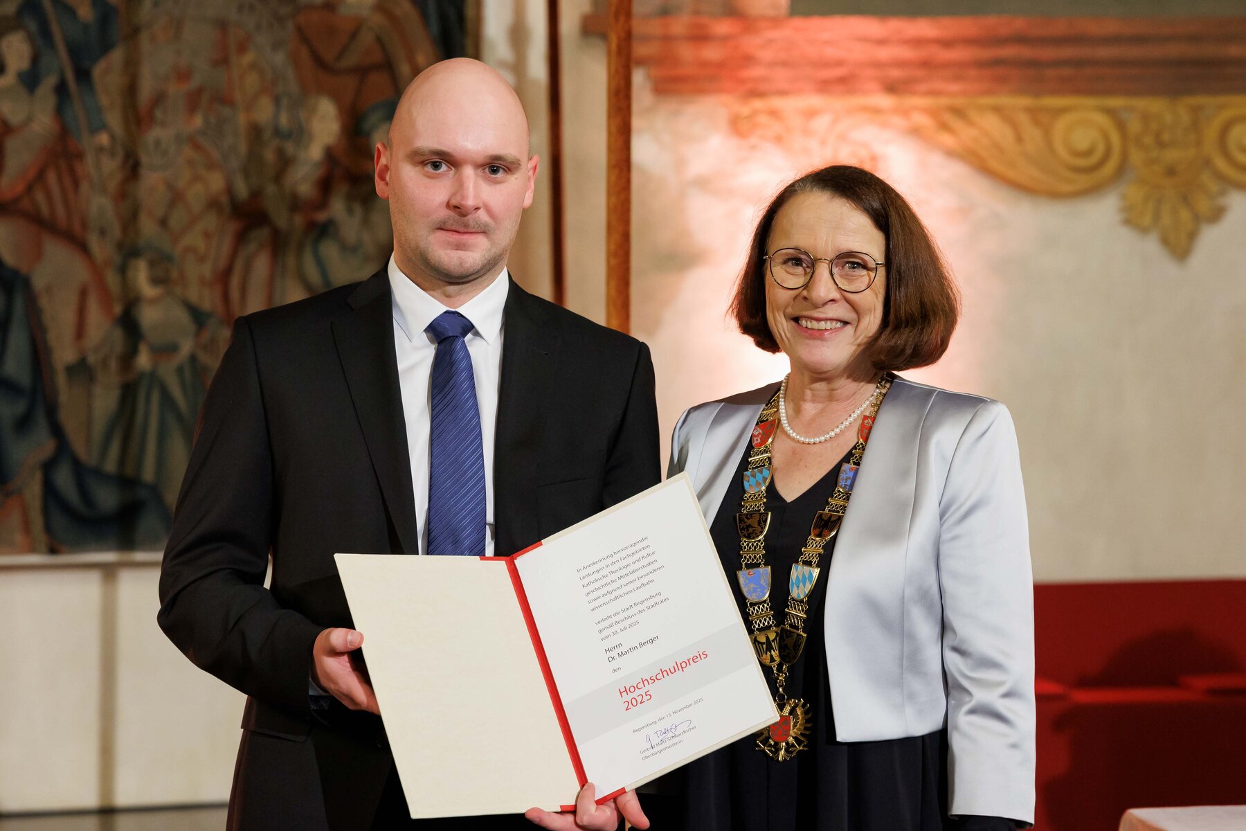 Im Reichssaal des Alten Rathauses Regensburg wurde der Hochschulpreis 2025 der Stadt Regensburg an Dr. Martin Berger verliehen. Ausgezeichnet wurde er für seine herausragende Dissertation „Der Ritus chori maioris ecclesiae Ratisponensis 1571“, die im Rahmen des DFG-Graduiertenkollegs „Metropolität in der Vormoderne“ an der Universität Regensburg unter der Betreuung von Prof. Dr. Harald Buchinger (Lehrstuhl für Liturgiewissenschaft) entstanden ist. Die Dissertation wurde im Juni 2024 an der Fakultät für Katholische Theologie mit summa cum laude angenommen. Mittlerweile ist Dr. Berger Postdoc-Assistent am Fachbereich für Liturgiewissenschaft und Sakramententheologie der Universität Wien.