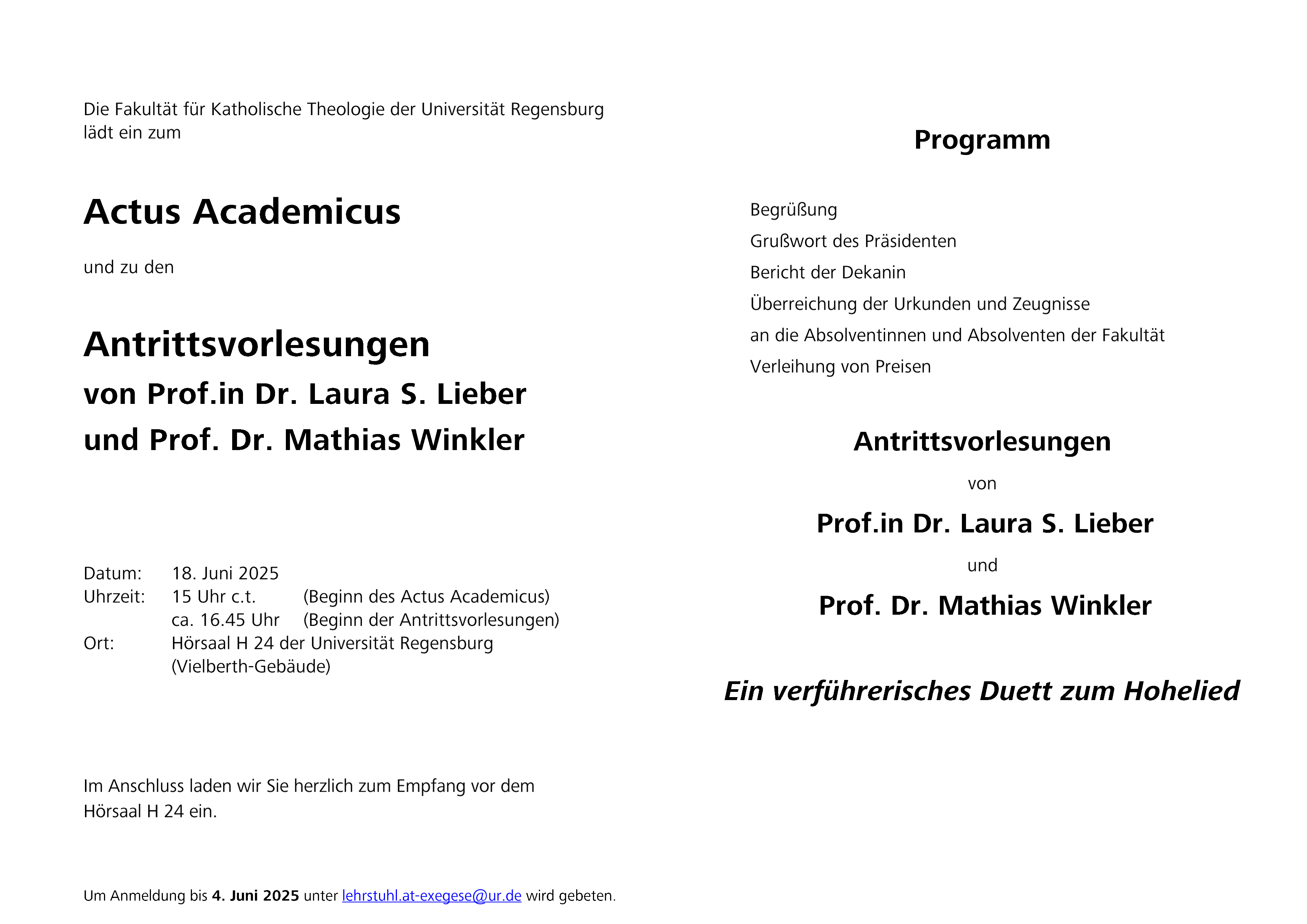 Die Fakultät für katholische Theologie der Universität Regensburg lädt ein zum Actus Academicus und zu den Antrittsvorlesungen von Prof.in Dr. Laura Lieber und Prof. Dr. Mathias Winkler mit dem Titel: