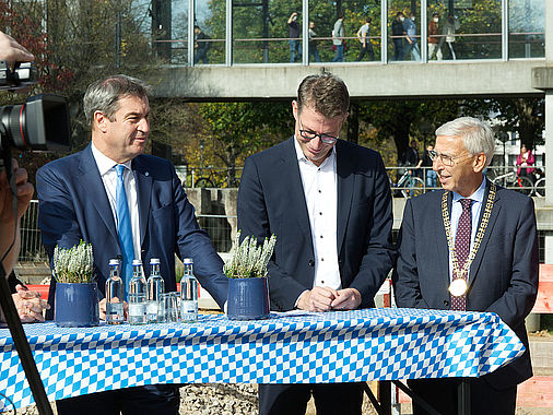 Bauminister Christian Bernreiter verwies in seiner Rede auf die aktuell schwierige Situation in der Baubranche und dankte allen Beteiligten für Ihr Engagement. „Trotz der schwierigen Lage gehen die Bauarbeiten am neuen Forschungsgebäude gut voran. Dank der herausragenden Leistung von Planerinnen und Planern, meinen Mitarbeiterinnen und Mitarbeitern vom Staatlichen Bauamt Regensburg sowie den Bauarbeiterinnen und Bauarbeitern wird das neue Zentrum für ultraschnelle Nanoskopie schon Ende nächsten Jahres in Betrieb gehen können.“