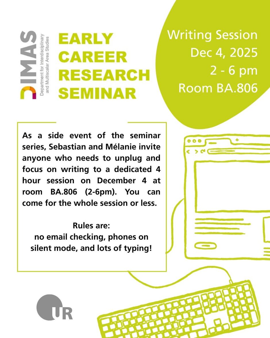 Sebastian Richter und Mélanie Sadozaï laden alle, die abschalten und sich auf das Schreiben konzentrieren möchten, zu einer speziellen 4-stündigen Sitzung am 4. Dezember im Raum BA.806 (14 - 18 Uhr) ein. Sie können die gesamte Sitzung oder nur einen Teil davon besuchen.