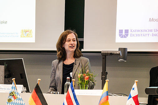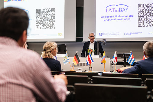 Professorin Dr. Anne Brüske betonte in ihrer Einführung "das Interesse und den Enthusiasmus der Universität Regensburg für die Zusammenarbeit mit Lateinamerika". Universitätspräsident Professor Dr. Udo Hebel begrüßt dies ebenfalls. Er machte die rund 50 Teilnehmenden in seinem Grußwort auf die verschiedenen bayerischen Hochschulzentren aufmerksam, die die Internationalisierung der bayerischen Hochschullandschaft mit verschiedenen Regionen – neben Lateinamerika auch Mittel-, Ost- und Südosteuropa, Indien oder China – voranbrächten. Sie ermöglichten die Anbahnung neuer Kooperationen und unterstützten den Austausch von Forschenden in beide Richtungen, der auch durch Mittel der Hightech-Agenda Bayern gefördert werde.
