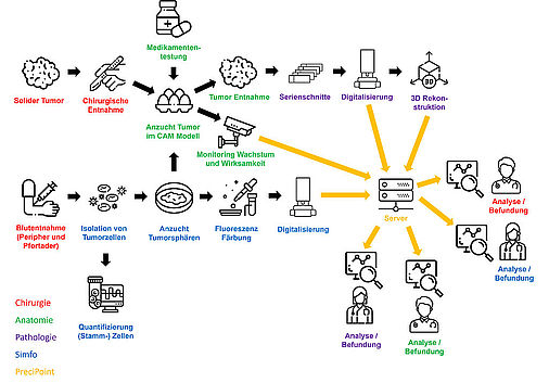 Der Industriepartner PreciPoint GmbH aus Freising wird eine Online-Plattform schaffen und ermöglicht dadurch die virtuelle Vernetzung der Chirurgie, Labormedizin, Anatomie, Pathologie und der Grundlagenforschung. Mit Hilfe der Plattform können die Metadaten, Befunddaten und Bilddaten direkt geteilt werden und die unterschiedlichen Abteilungen dadurch schnell und effektiv zusammenarbeiten. Mit der Entwicklung neuer Algorithmen werden strukturelle Analysen der Daten und das Wirkstoffscreening der Proben mit bestimmten Charakteristika ermöglicht. Eine weitere Neuerung wird eine Kombination aus Hellfeld- und fluoreszenzbasierter Mikroskopie sein, um die Darstellung der Bilder und die Ansicht zwischen unterschiedlichen Aufnahmemodi zu erleichtern.
