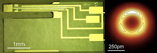 - Eine sehr hohe Federkonstante, ermöglicht ihm, Kräfte mit kurzer Reichweite mit hoher Empfindlichkeit bei Amplituden von nur einigen zehn Pikometern zu erfassen, was mit Cantilever-Sensoren unerreichbar war. Dadurch wurde der Kontrast auf atomarer Ebene drastisch verbessert.