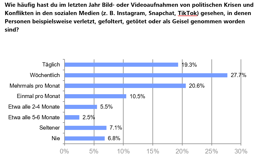Verstörende Videos oder Bilder von Kriegen und Konflikten, die Verwundung, Folterung, Tötung, Geiselnahme oder ähnliches zeigen, werden dabei von fast der Hälfte der Jugendlichen mindestens wöchentlich gesehen – fast jeder fünfte Jugendliche sieht solche Aufnahmen sogar täglich, männliche Jugendliche bzw. junge Erwachsene häufiger als weibliche.