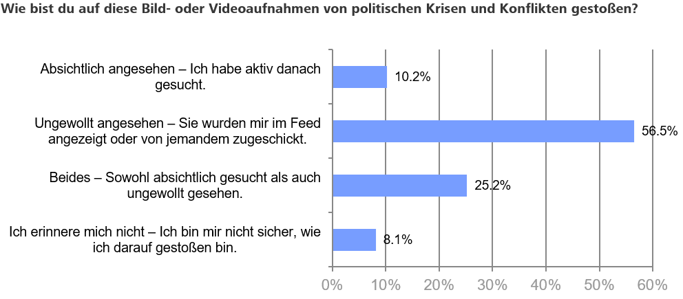 Dabei werden diese belastenden Szenen meist nicht absichtlich gesucht, sondern überwiegend ungewollt gesehen, z. B. durch Social-Media-Feeds oder weil ihnen die Videos zugeschickt werden.