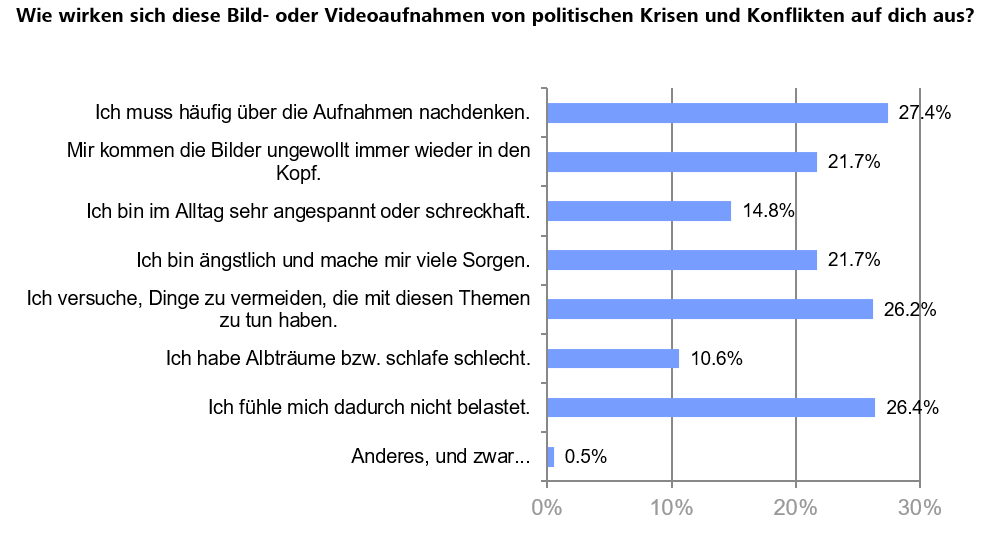 Über die Hälfte der Jugendlichen und jungen Erwachsenen fühlt sich durch die Geschehnisse auf der Welt wie politische Krisen, internationale Konflikte (z. B. Ukraine, Naher Osten) und Gewalttaten im öffentlichen Raum belastet. Dabei erleben die Jugendlichen dies meist stark als persönliche, sie selbst betreffende Bedrohung.