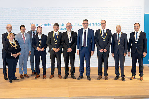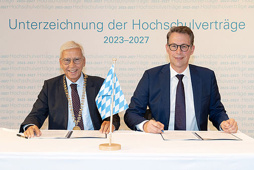 Am 21. September 2023 unterzeichnete Präsident Prof. Dr. Udo Hebel in der Akademie der Wissenschaften in München den Hochschulvertrag der Universität Regensburg für den Zeitraum 2023-2027. Die neuen Hochschulverträge lösen die bisherigen Zielvereinbarungen zwischen Freistaat und Hochschulen als Instrument der Hochschulsteuerung ab – so sieht es das neue Bayerische Hochschulinnovationsgesetz (BayHIG) vor. Im jetzt unterzeichneten Hochschulvertrag setzt die Universität Regensburg eigene Schwerpunkte in den Kernbereichen Forschung, Studium & Lehre sowie in der Gleichstellung und Digitalisierung.