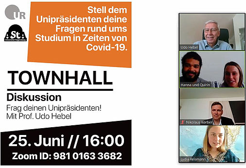 Wie geht es weiter im Wintersemester? Online? In Präsenz? Der Studentische Sprecher*innenrat lud am 25. Juni zu einem weiteren – diesmal digitalen – Town-Hall-Meeting an der Universität Regensburg ein. 40 Studierende loggten sich ein und folgten dem Aufruf ihrer Vertreter:innen: „Stell dem Unipräsidenten deine Fragen rund ums Studium in Zeiten von COVID-19“. Über eineinhalb Stunden zoomten sie mit Universitätspräsident Professor Dr. Udo Hebel und Professor Dr. Nikolaus Korber, Vizepräsident für Studium, Lehre und Weiterbildung. Deren Botschaft war klar: Den Studierenden werden aus der aktuellen Situation keine Nachteile entstehen. Und alle vermissen die Präsenzuni.