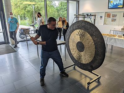 Ein besonderes Highlight, das den Teilnehmenden neben dem wissenschaftlichen und informellen Austausch sicher in Erinnerung bleiben wird, bestand in einem über 30 kg schweren und 130 cm breiten Gong. Dieser wurde für die Dauer des Symposiums freundlicherweise vom Universitäts-Orchester zur Verfügung gestellt und verkündete mit seinem das gesamte Vielberth-Gebäude durchschallenden Klang das Ende jeder Pause. Der Gong war unter den Teilnehmenden so beliebt, das eine Warteliste dafür geführt wurde, wer den Gong als nächstes betätigen darf.