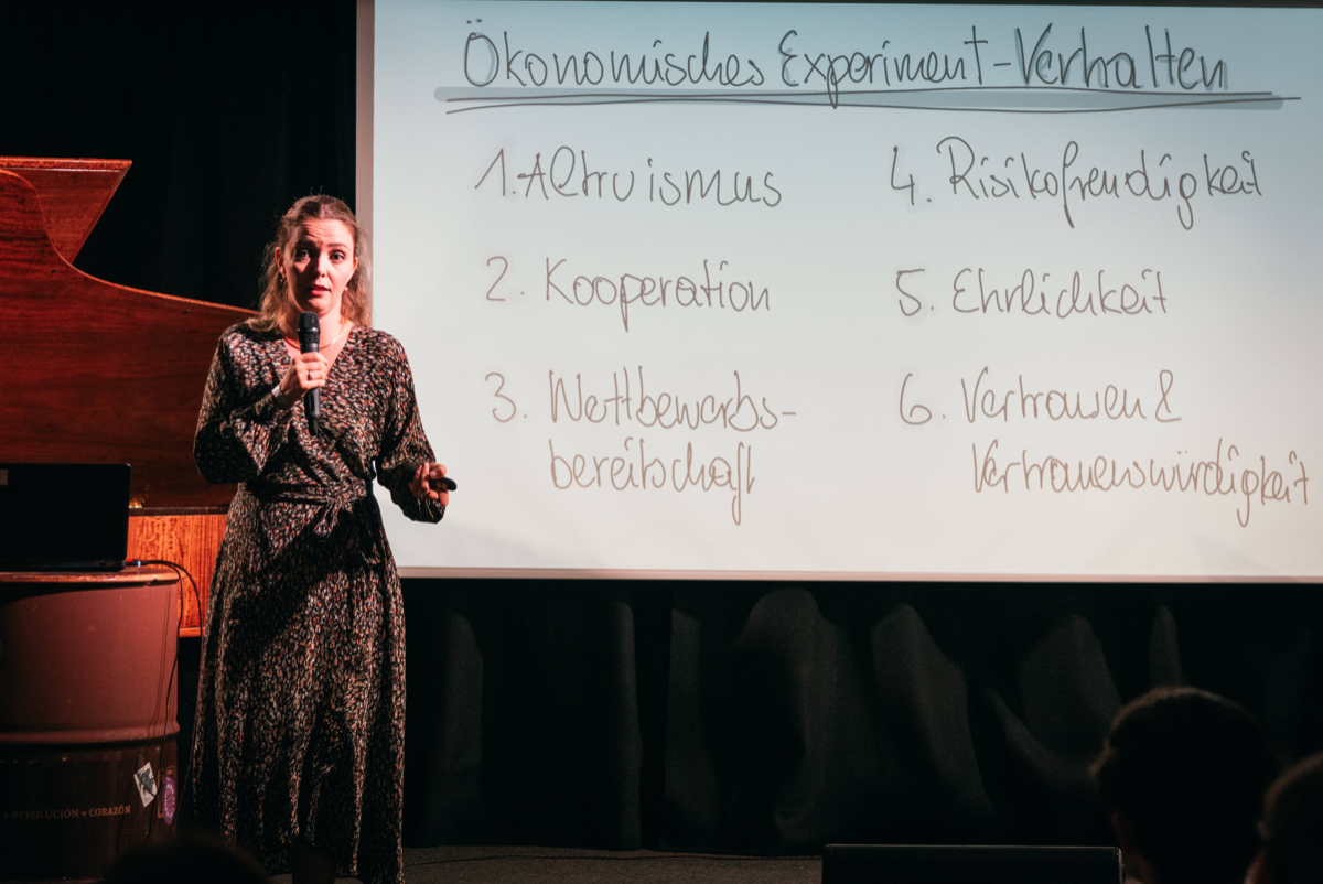 Den Auftakt in den Abend machte die Verhaltensökonomin Dr. Helena Fornwagner mit ihrem Vortrag „Darm an Hirn – und wer entscheidet hier jetzt eigentlich?“. Jeder Mensch trifft täglich soziale und ökonomische Entscheidungen. „Bier? Wein? Nüsschen? Wie sie sehen, gibt es immer viel zu entscheiden“, begann Dr. Fornwagner daher auf der Bühne des Deggingers ihren Vortrag. Als Verhaltensökonomin interessiere sie sich von Haus aus aber vor allem für Entscheidungen bei denen Geld involviert ist. Hier habe man unter anderem im Bereich der Psychologie in den zurückliegenden Jahren bereits viele Erkenntnisse bezüglich der Ursachen für Entscheidungen sammeln können. Keine wissenschaftlich fundierten Untersuchungen gebe es hingegen zu den sogenannten „Bauchentscheidungen“, die zwar jeder kenne, jedoch niemand wisse, wie sie schlussendlich zustande kommen. Daher habe sie sich die Frage gestellt, ob es sein könne, dass diejenigen Lebewesen, die im menschlichen Darm leben, für eben diese Bauchentscheidungen verantwortlich sein könnten. Und tatsächlich. In einer weltweit ersten wissenschaftlichen Studie zu diesem Thema, konnte Dr. Fornwagner in Zusammenarbeit mit u.a. dem Verhaltensökonomen Prof. Loukas Balafoutas von der Universität Innsbruck sowie Prof. Dr. Alexander Moschen und Dr. Simon Reider vom Universitätsklinikum Linz, im Rahmen eines ökonomischen Experiments einen direkten Zusammenhang zwischen bestimmten Darmbakterien und ökonomischem Verhalten nachweisen „Wir konnten erstmals beweisen, dass es einen Zusammenhang zwischen dem Darm und bestimmten ökonomischen Entscheidungen gibt. In diesem Forschungsbereich haben wir quasi einen neuen Planeten entdeckt“, freute sich Dr. Fornwagner sichtlich. Derzeit werden noch abschließende Tests durchgeführt bevor die Ergebnisse veröffentlicht werden. Abschließend beantwortete Dr. Fornwagner zahlreiche Fragen zum Experiment selber, zu den Probanden und zu den Auswirkungen ihrer Ergebnisse, schränkte aber auch ein: „Wie bei jeder Forschung, die so neu ist, müssen wir jetzt Schritt für Schritt weiter gehen. Diese Ergebnisse sind der erste Babyschritt, mit dem wir in eine ganz neue Richtung gehen und ich freue mich darauf zu erleben, wo die Forschung hier künftig hinführen wird.“