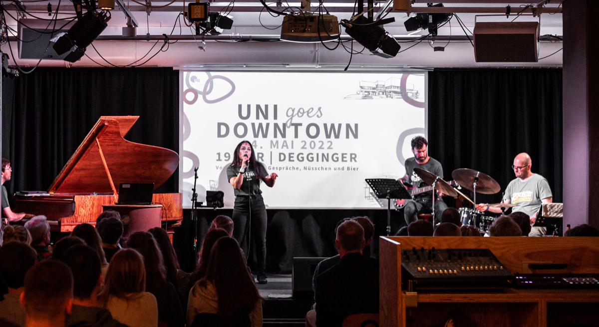 Endlich, nach über zwei Jahren coronabedingter Zwangspause ist das beliebte Live-Format „Uni goes Downtown“ in seiner dritten Auflage wieder zurück im Degginger, dem Kultur- und Kreativzentrum der Stadt Regensburg. Am Dienstagabend traf sich das Publikum, um in loungiger Atmosphäre bei Bier, Wein und Nüsschen den Vorträgen von Dr. Helena Fornwagner, Verhaltensökonomin am Lehrstuhl für empirische Wirtschaftsforschung der Universität Regensburg und Prof. Dr. John Lupton, Institut für Experimentelle und Angewandte Physik der Universität Regensburg, anzuhören. Beide Wissenschaftler:innen zogen die Gäste mit ihren unterhaltsamen, etwa fünfzehnminütigen Vorträgen in ihren Bann. In den anschließenden Diskussionsrunden wurden die Fragen der Zuschauer beantwortet. Musikalisch begleitet wurde der Abend von der Uni Jazz Combo.