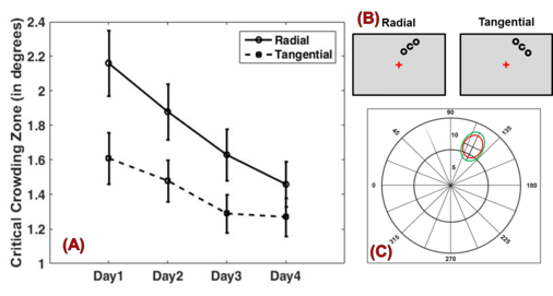 In den Lehrbüchern der Psychologie wird die Crowding-Zone meist als Ellipsoid dargestellt; die Achsen dieses Ellipsoids geben an, wie weit die Störreize vom zu erkennenden Objekt entfernt sein müssen, damit sie die Wahrnehmung gerade nicht mehr beeinträchtigen. Dieser Abstand war bei den 17 Probanden vor dem Training in der radialen Ausrichtung verhältnismäßig größer als in der tangentialen Ausrichtung (Abbildung 1C, grünes Ellipsoid). Nach dem Training hatte dieser Abstand insbesondere entlang der radialen Achse abgenommen (Abbildung 1C, rotes Ellipsoid). Das zeigt, dass die Anisotropie zwischen diesen beiden Bedingungen zurückging.