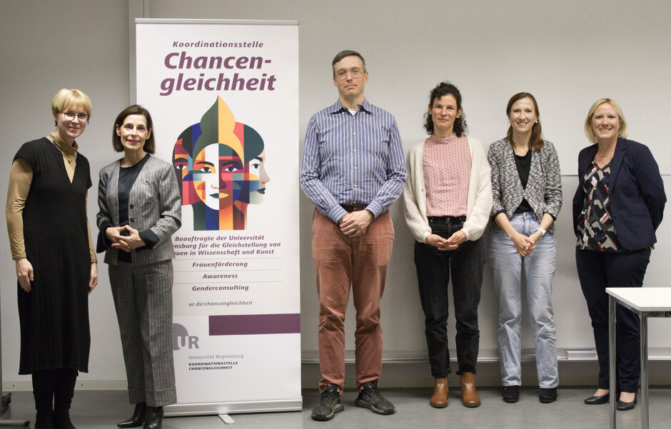 Wie beeinflusst Elternschaft wissenschaftliche Karrieren? Welche Strategien und Angebote unterstützen Eltern in der Wissenschaft im Alltag? Wie können Führungskräfte Vereinbarkeit konkret unterstützen? Diese und viele weitere Fragen wurden am Montag, 27.10.2025, unter der Moderation von Prof.in Dr. Astrid Ensslin und Prof.in Dr. Miriam Banas, Beauftragte und stellvertretende Beauftragte der Universität Regensburg für die Gleichstellung von Frauen in Wissenschaft und Kunst, diskutiert. Sie sprachen darüber mit Dr. Angela Bauer, Wissenschaftliche Mitarbeiterin an der Fakultät für Humanwissenschaften der UR, Prof.in Dr. med. Dr. h. c. Martina Müller-Schilling, MHBA, Direktorin der Klinik und Poliklinik für Innere Medizin I am UKR, PD Dr. Jay Weymouth, Akad. Oberrat an der Fakultät für Physik der UR, und M.A. Manuela Zachmayer, Referatsleitung Personalentwicklung und -gewinnung an der UR. Die Veranstaltung fand in Präsenz statt und wurde zur Förderung der Vereinbarkeit zudem digital übertragen.