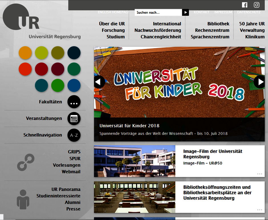 Seit Juni 2018 wurden Verlinkungen zu Facebook und Instagram angeboten, wo die Universität nun auch regelmäßig Präsenz zeigt.